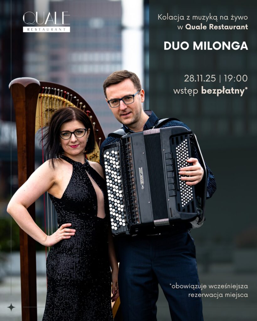 28 listopada o godzinie 19:00 w naszej restauracji wystąpi Duo Milonga, czyli Aneta Salwińska (harfa) i Konrad Salwiński (akordeon). 🤗